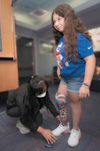 Shriners Children’s New England prosthetist Eunice Wong makes final adjustments to Mariah’s custom prosthesis.