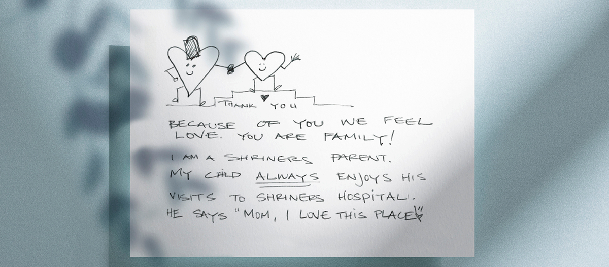 A grateful parent shared this heartfelt note with the team at Shriners Children’s Salt Lake City, echoing a sentiment we hear often – that our staff feels like family.