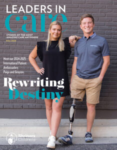 El equipo que trabaja detrás de Líderes en el cuidado se dedica a brindarles historias sobre las superestrellas de Shriners Children’s: nuestros inspiradores pacientes y nuestros increíbles proveedores de atención médica. Nos enorgullece compartir que la revista recibió recientemente un premio de Oro de los premios Healthcare Advertising por nuestro trabajo en la edición de otoño de 2024, con los Pacientes Embajadores a nivel Internacional, Paige y Grayson, en la portada. El premio sitúa a Líderes en el cuidado entre el 10% de los mejores candidatos de entre más de 4,300 participantes. Además, el video de Shriners Children’s “Rewriting Destiny: The Stories of Paige and Grayson” ganó cuatro premios Telly, entre ellos, uno de plata y tres de bronce. Estos prestigiosos premios honran realmente a los pacientes de Shriners Children’s y a todos los que forman parte de nuestro sistema de atención médica, quienes trabajan para llevar esperanza y recuperación a los niños de todo el mundo.