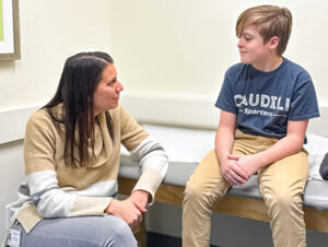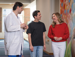 El Dr. Bojovic habla con su paciente Ben y su madre, Jessica, sobre cómo hacer el seguimiento tras el tratamiento.